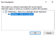 3. [テキスト チェックポイント]オブジェクト選択ダイアログ・ボックスで,[WpfObject]オブジェクトを選択し,[OK]をクリックします。[テキスト チェックポイントのプロパティ]ダイアログ・ボックスが開きます。