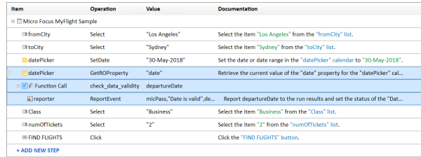 キーワード・ビューに切り替えて,新しい datePicker GetROProperty ステップおよび関数の呼び出しステップを確認します。