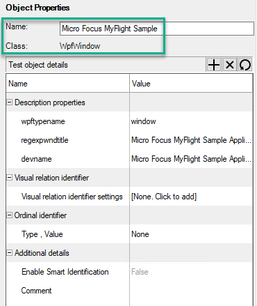 [オブジェクト リポジトリ マネージャ]ウィンドウで,Micro Focus MyFlight Sample オブジェクトを選択します。これは,[FLIGHT DETAILS]ページの他のすべてのオブジェクトの親オブジェクトです。右側にこのオブジェクトのプロパティが表示されます。