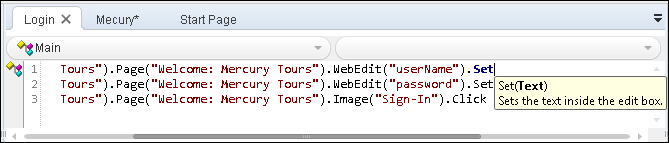 ヒント: エラーが発生したメソッドにカーソルを合わせ、F1 キーを押すと、選択したメソッドに関する 『Object Model Reference for GUI Testing』 のヘルプ・トピックが表示されます。