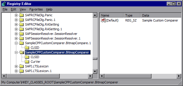 ほかの環境では、各コンピュータでのインストールまたは登録プロセスの一部として、名前を設定またはカスタマイズできます。たとえば、Visual Basic でカスタム比較ツールを開発する場合、このレジストリ値は自動的に COM オブジェクトの ProgID に設定されます。カスタム比較ツールを変更する場合は、比較ツールをインストールしてから、手動でレジストリを編集するか、インストールと登録を実行して、この値を編集するプログラムを設計します。