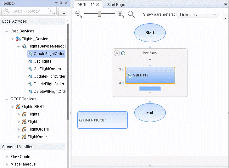 ステップを別のステップにリンクできます。たとえば,GetFlights Web サービス・メソッドを CreateFlightOrder メソッドにリンクすると,2 つのメソッド間でフライト情報をやり取りできます。