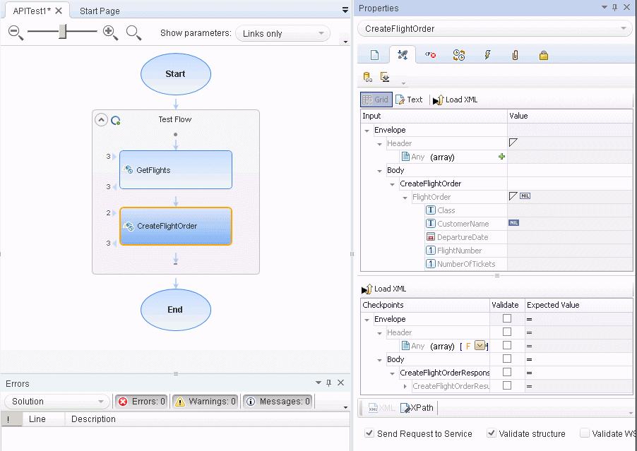 テスト・ステップを追加し,入力プロパティ,出力プロパティ,チェックポイントのプロパティを指定したら,テストを実行して,その結果を確認します。実行結果でテスト・フローを表示し,各テスト・ステップの結果と応答を確認してください。