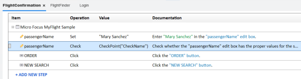1. UFT One 关键字视图中,打开 MyFlightCheckpoint 测试中的 FlightConfirmation 操作。