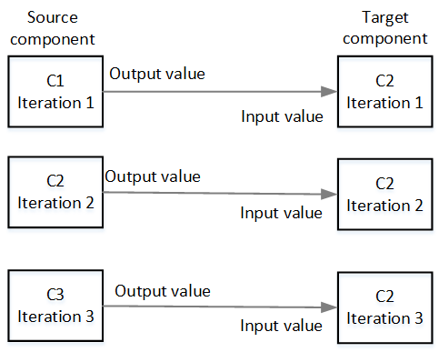 将上一个组件的输出参数作为后续组件的输入参数值时,输出和输入参数之间的链接将应用于输入参数的所有组件迭代。同样,当业务流程测试中的源组件的迭代产生多个输出参数值时,给定迭代运行提供的值将作为输入传递给目标组件的相应迭代。