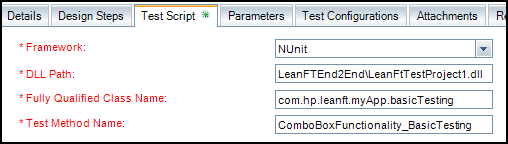 In the Test Script tab of the test, define your test. Provide values for required fields, as follows: