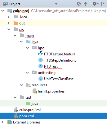 • pom.xml. Includes OpenText Functional Testing for Developers and Cucumber dependencies for Maven.