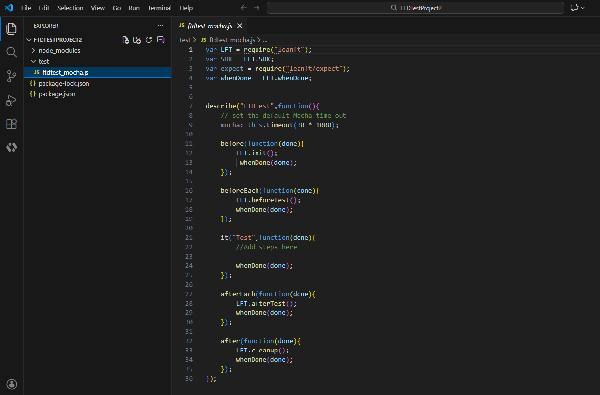 - Node_modules folder, which contains the LeanFT SDK, testing framework, and the LeanFT SDK runner module. (npm installs this automatically.)