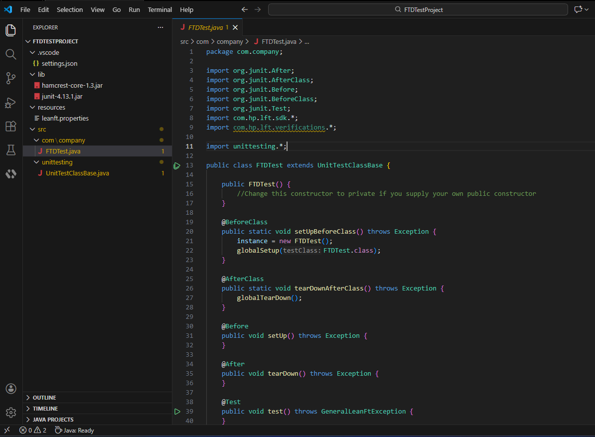 A basic FTDTest.java template where you write your tests. The exact structure of this template depends on whether you are writing a JUnit or TestNG script. In both cases, it includes attributes where you can define: