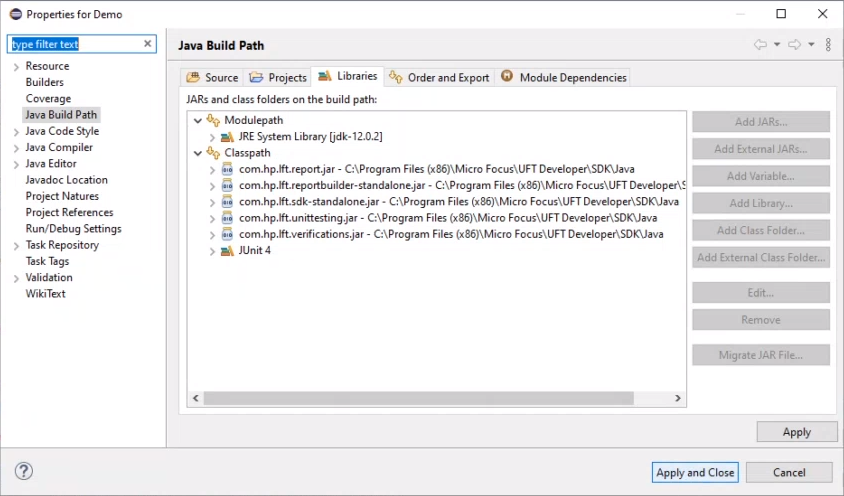 • References to the com.hp.lft.sdk, com.hp.lft.report, com.hp.lft.unittesting, com.hp.lft.verifications, and com.hp.lft.reportbuilder-standalone libraries.