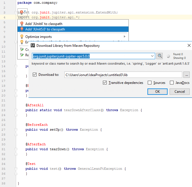 Example: A new JUnit project in IntelliJ IDEA: