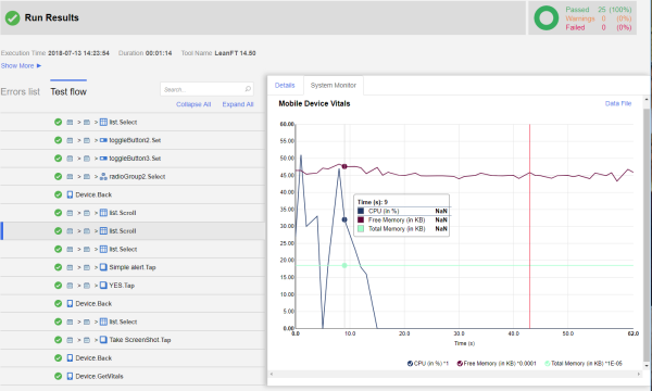 OpenText Functional Testing for Developers's mobile SDK includes an API for checking a device's CPU and memory usage. The information retrieved is an accumulation of the vitals from the moment the device was locked until it has been released.
