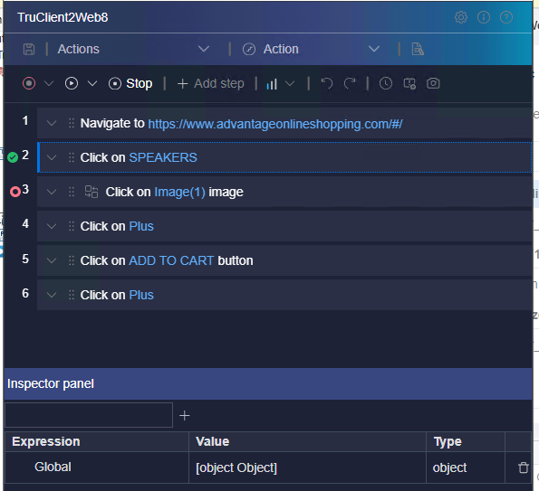 The Inspector panel is displayed when the script encounters a breakpoint during replay in interactive mode. Breakpoints pause the run of the script run at the specified step.