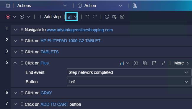 You can run your script step by step, to view the replay more slowly and in a controlled manner. Open the dropdown menu for the Replay button and select Replay step by step. Repeat this for each step as required.
