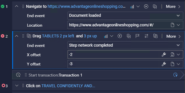 Steps contain a user action to perform, object identification, and the point where the next step can start. They can be recorded steps, or other steps you manually add to the script.