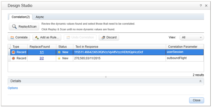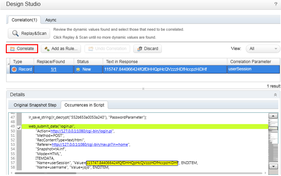 Record a business process in VuGen. At the end of script generation, the Design Studio runs an automatic scan on the script and searches for dynamic values that need to be correlated. It displays the results in a table.