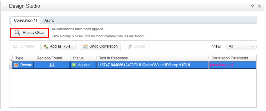 Click Replay&Scan to scan for more dynamic values to correlate. Optionally, click Add as Rule to ensure that other similar dynamic values are recognized for correlation.
