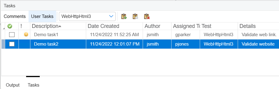 This pane enables you to add, edit and track tasks associated with an individual script or the overall goals of the project. Tasks are divided between user defined tasks and tasks that are inserted into the Vuser script as action items using keywords such as ToDo, Undone and FixMe.